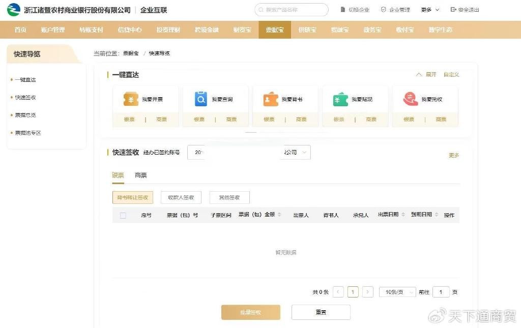 接下来点击 票据宝 - 快速签收,选择经办已签约账号,再选择“银票”项下的“背书转让签收”,这样上家背书进来以“5”开头的新一代票据,都会在列表中显示出来。选择需要签收的新一代票据,再点“批量签收”,按提示完成经办操作。