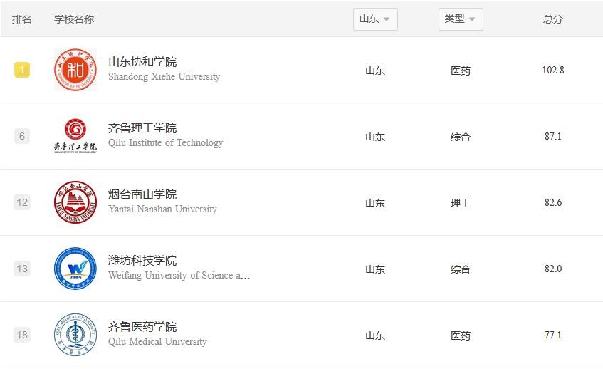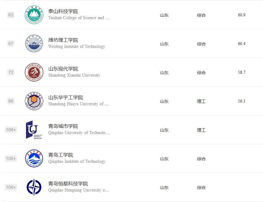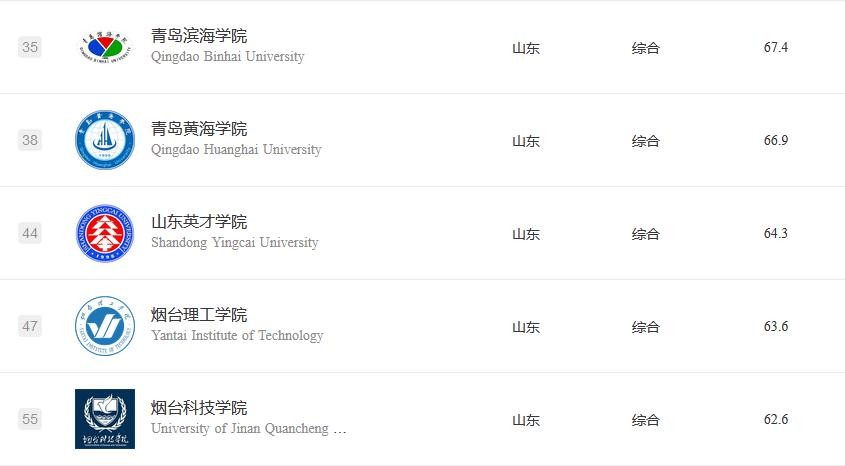此外,排名第六至第十的院校分别为青岛滨海学院、青岛黄海学院、山东英才学院、烟台理工学院和烟台科技学院,均为综合类大学。