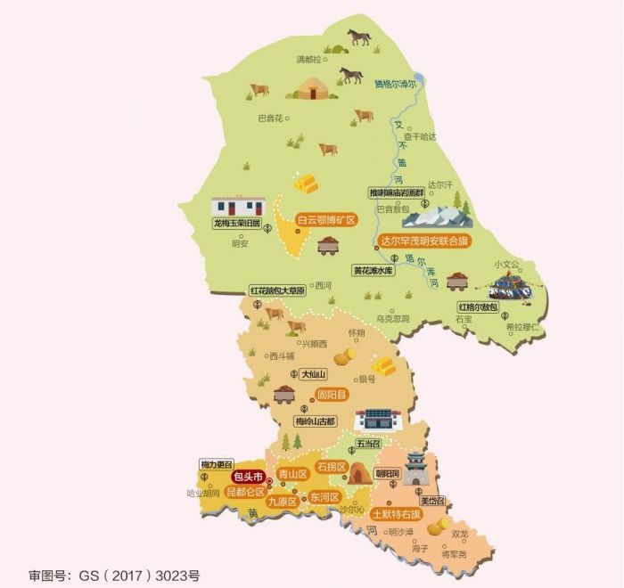 包头在蒙古语中意为“有鹿的地方”,又称“鹿城”。包头是我国西北著名的皮毛集散地和水旱码头,资源富集,被誉为“草原钢城”“稀土之都”。境内有五当召、红格尔敖包等风景名胜。