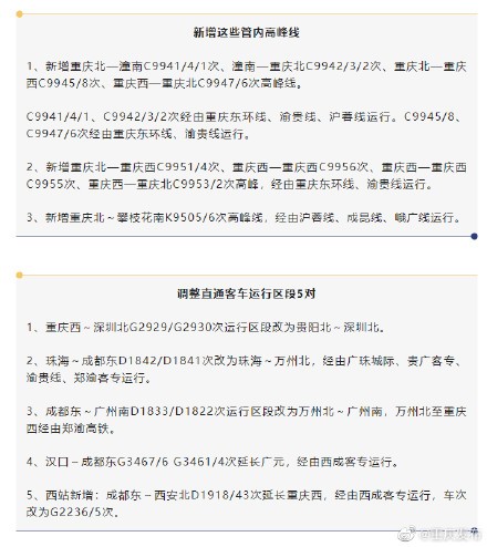 今(26)日,中国铁路成都局集团公司重庆火车站消息,12月26日零时起将执行2023年第一季度调整列车运行图,重庆将新增到贵阳、遵义、阆中等9对日常线客运列车,新增重庆到潼南、攀枝花等高峰线客运列车,满足旅客的出行需求。旅客列车调整图自2022年12月26日零时起实行。调整图过渡期为2022年12月23日至2022年12月29日。2023年第一季度调整列车运行图执行后,全站开行旅客列车316.5对(较2022年第四季度图增加4对,日常线282.5对、周末线3对、高峰线31对)。