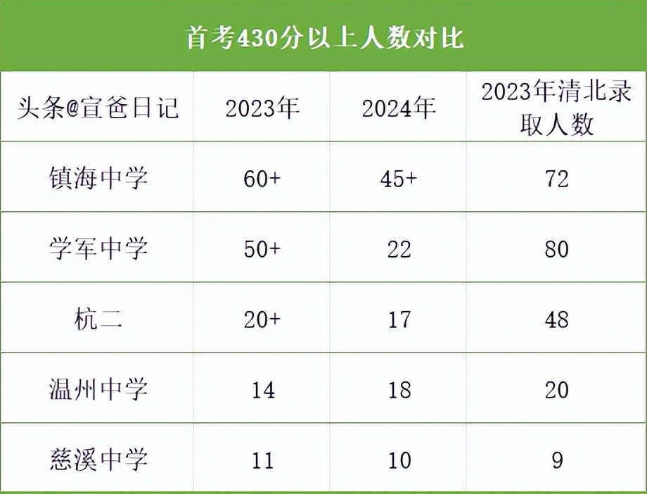 附:2024年1月首考省内主要高中高分(430分及以上)分布对比:
