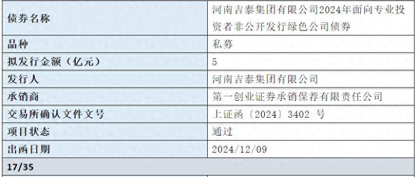 【大河财立方消息】12月11日,河南吉泰集团有限公司2024年面向专业投资者非公开发行绿色公司债券项目,已获上交所通过。