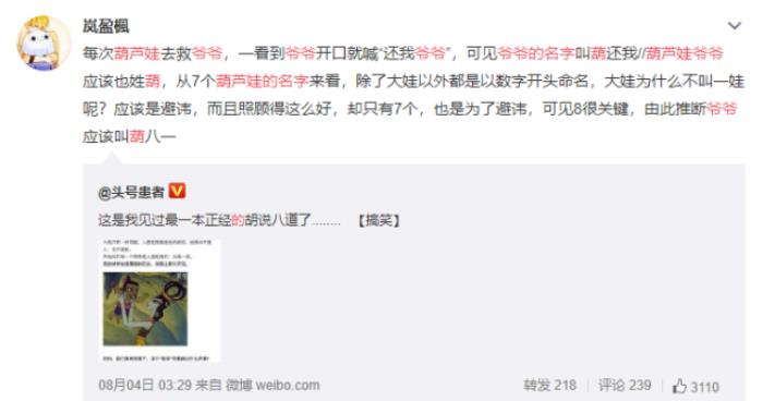 尽管网友的分析看上去是一本正经的胡说八道,然而“葫八一”这个名字还是非常有可能的,如此一来,葫芦七兄弟的名字就应该是葫大娃、葫大娃、葫二娃、葫三娃、葫四娃、葫五娃、葫六娃和葫七娃,一家子的名字非常和谐。
