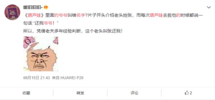 只是网友的猜测怎么会止步于此,对于葫芦娃爷爷的名字,还有一个说法,网友将葫芦娃对妖精所说的话进行了断句,葫芦娃其实说的是:“还,我爷爷!”如果葫芦娃耶耶耶是姓张的话,那么爷爷真正的名字就叫做“张还”。
