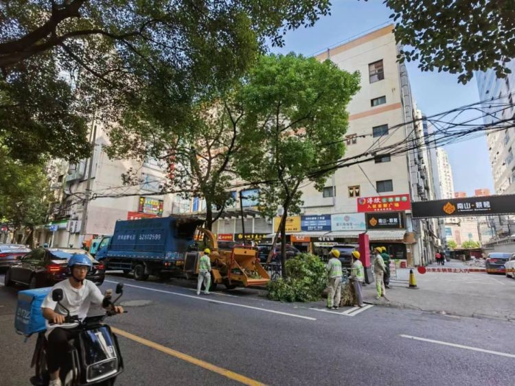 闻讯而动的街道林长办立即发挥党建引领作用,协调专业养护队,在与梅芳里居民区“街社治理联盟”商讨作业时间后,顺利完成了新会路一侧行道树的绿化治理、修剪。同时,街道林长办借助树枝粉碎机进行了现场清理,处理好修剪下的树枝,实现“即修即清”,丝毫未损道路畅通。