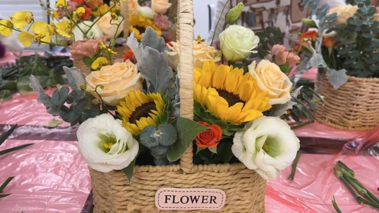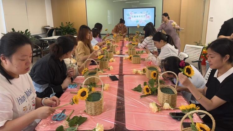 在老师的指导、带领下,学员们还自己动手将创意与向日葵、玫瑰、洋桔梗、尤加利叶等材料融为一体,很快,一个又一个形式各样、个性十足的花篮就“诞生”了。