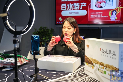 2022年11月6日,合水县电商孵化园内内,主播直播销售苹果。