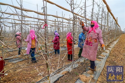 2024年3月15日,镇原县庆阳居立农业发展有限公司示范基地内,果农进行枝条修剪。