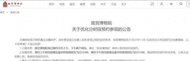 故宫博物院最近发布了一项新规定,从今年11月1日开始实施。根据这项规定,参观者需要在预约时选择上午或下午的时段。上午时段的入院截止时间是中午12时,下午时段的入院时间则从上午11时开始。这样的安排旨在给参观者留出充裕的缓冲时间,避免长时间在午门外等待,也确保参观者能够有足够的时间参观。据故宫博物院开放管理处副处长张博辉介绍,如果上午时段的观众在12点后才检票,系统会提示“已过期”,不允许入院参观。同样地,如果下午时段的观众在11点前检票,系统会提示“未生效”,同样无法入院参观。如果参观者无法按时参观,无论是上午还是下午的预约,都可以在当天20时之前在小程序中自主申请退票。不过,需要注意的是,每次爽约都会记录一次,超过20时就不能退票了。这项新规定的实施,有助于更好地管理参观者的流量,减少拥堵和等待时间。参观故宫是许多游客的梦想,通过这样的措施,可以更好地保障观众的参观体验。