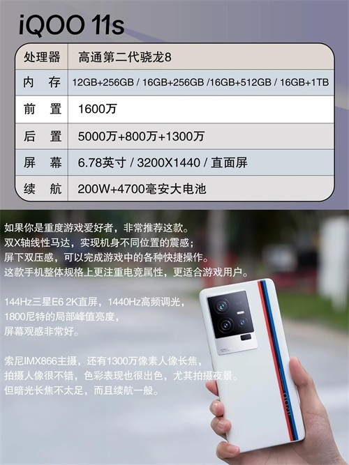 这款手机整体规格上更注重电竞属性,更适合游戏用户。144Hz三星E6 2K直屏,屏幕观感非常好。索尼IMX866主摄,还有1300万像素人像长焦,拍摄人像很不错,色彩表现也很出色,尤其拍摄夜景。但暗光长焦不太足,而且续航一般。