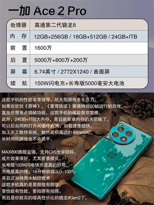 这款手机是你能买的缀具性价比的骁龙8Gen2了。24GB+1TB大内存,MAX890旗舰主摄,支持OIS光学防抖,成片效果很好,尤其夜景模式。长寿版150W闪电快充是真的好用,充电是真的快,16分钟就能从0~100%,并且还加持雨水触控技术。