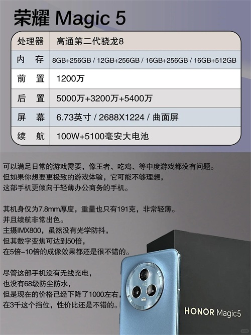 可以满足日常的游戏需要。但如果你想要更极致的游戏体验,它可能不够理想,这部手机更倾向于轻薄办公商务的手机。其机身非常轻薄。并且续航非常出色。主摄IMX800,虽然没有光学防抖,但其数字变焦可达到50倍,在5倍-10倍的成像效果都还是很不错的。尽管这部手机没有无线充电,也没有68级防尘防水,但是现在的价格已经下降了1000左右,在3千这个挡位,性价比还是不错的。