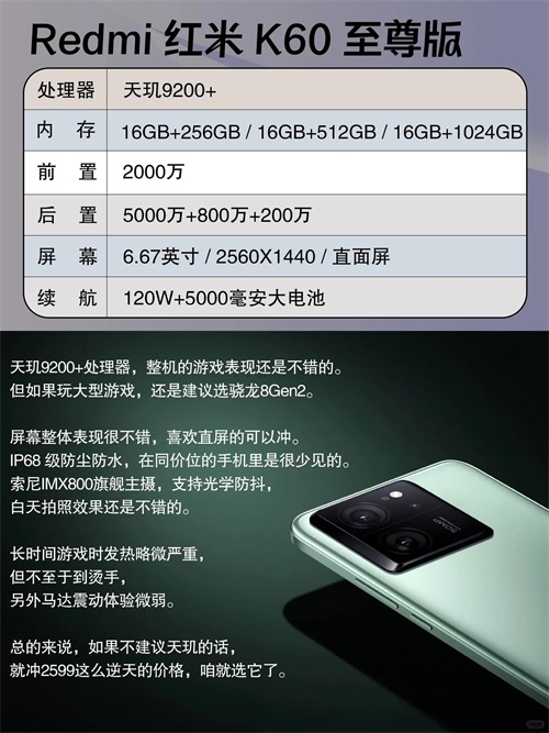 索尼IMX800旗舰主摄,支持光学防抖,白天拍照效果还是不错的。长时间游戏时发热略微严重,但不至于到烫手,另外马达震动体验微弱。总的来说,如果不建议天玑的话,就冲2599这么逆天的价格,咱就选它了。
