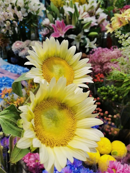 夏花如梦,除了琳琅的玫瑰外,绣球、雏菊、向日葵也落落大方地向众人展示着自己婀娜的身姿。其中,每一片形似蝴蝶的绣球花瓣热闹地前簇后拥着,呈现出层层叠叠的渐变美;精致的小雏菊看似柔弱纤细,却展现着顽强生机;而向日葵则咧开了嘴,露出明媚的笑容。