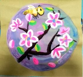 1.牛皮纸用铅笔轻轻画出圆形,蓝紫色画出圆形背景。(此步骤可由老师根据本班情况课前完成)