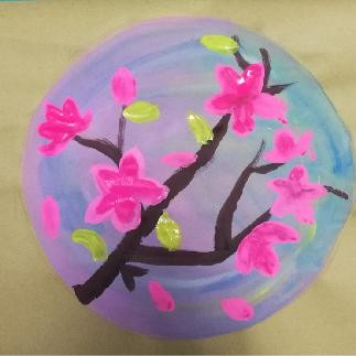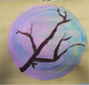 2.先用粉红色、浅蓝色涂背景。接着画出褐色的树干和树枝