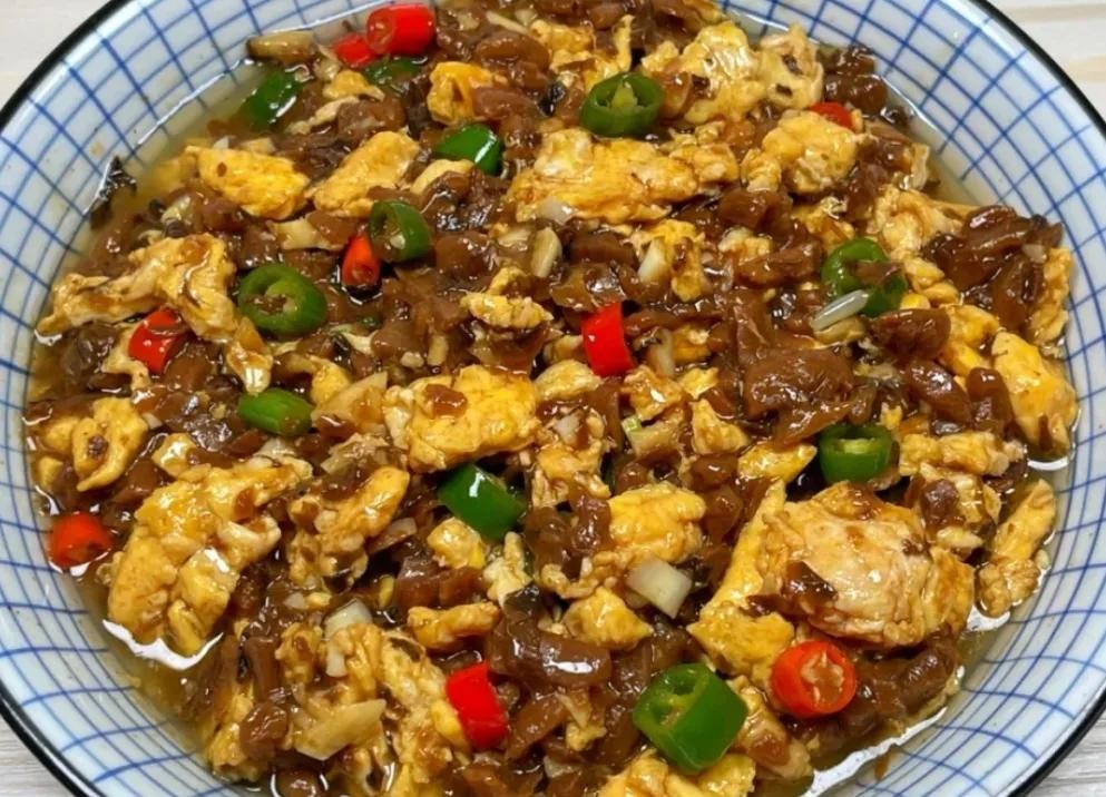 (5)倒入调好的料汁和炒熟的鸡蛋,大火翻炒均匀入味,关火出锅。