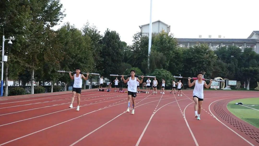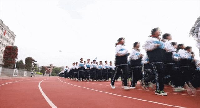 高二学生围着球场跑操,整齐的步伐和响亮的口号,彰显了他们坚韧不拔的意志和积极向上的精神风貌。
