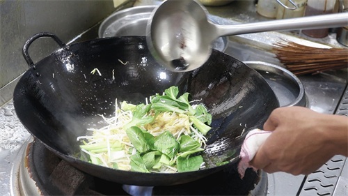 4.再倒入小豆芽,快速翻炒片刻,倒入大青菜,继续翻炒。