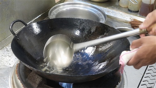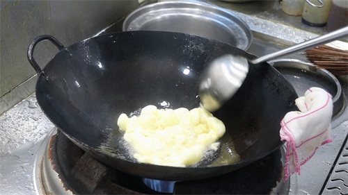 3.等油温至5成热时,倒入鸡蛋液,用勺子连续翻炒几下。