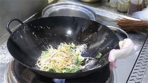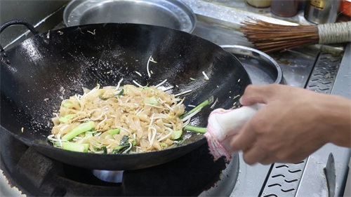 6.放入河粉,快速翻炒15秒,起锅开始调味,加入鸡精1克,胡椒粉1克,食盐1克,生抽10克从锅边淋入。