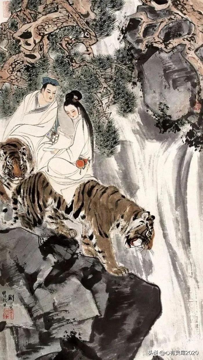 这是徐悲鸿的九歌山鬼,画面的背景是崇山峻岭的大山中,可爱的女孩和如虎如豹的山鬼融为一体,很好地体现了人与自然和谐共处的主题!