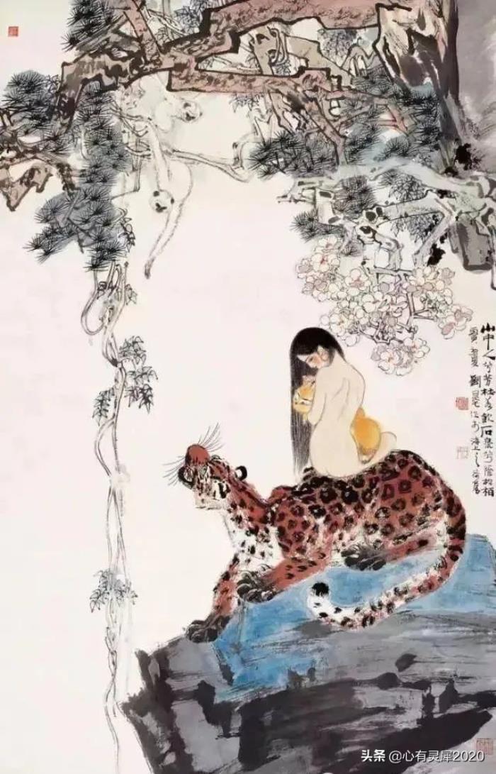 如黄永玉笔下的山鬼,画面更为温馨,女孩把小的虎豹抱在怀里,当作了自己的孩子!每一种生命都值得敬畏,不管是蚂蚁还是老虎狮子,任何时候人类都不应该去伤害它们!