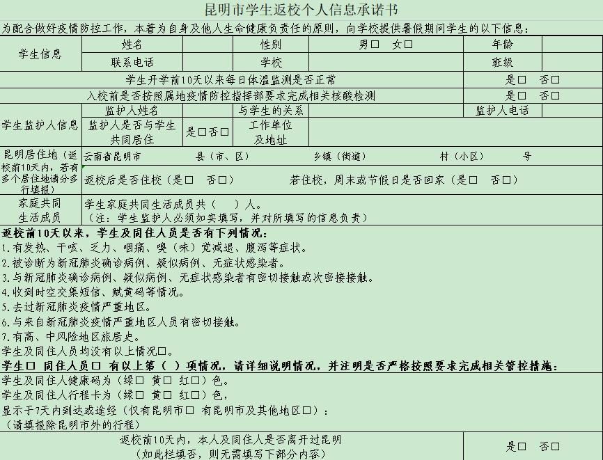 三、昆明市学生返校个人信息承诺书