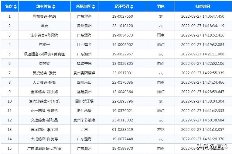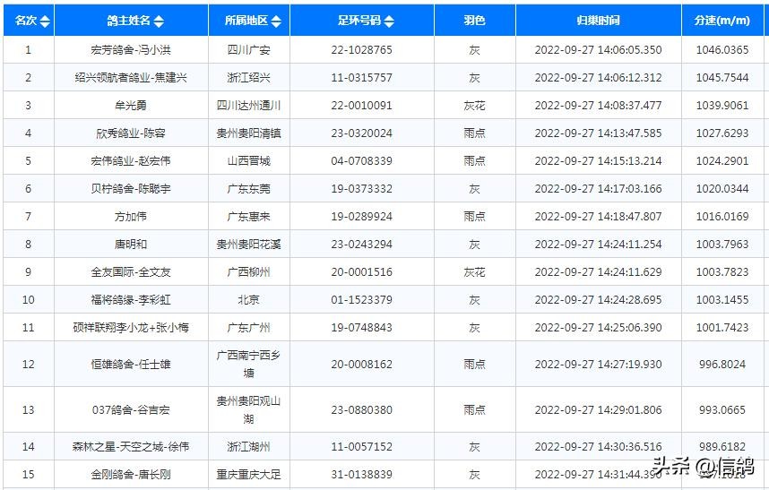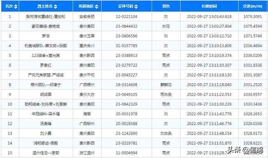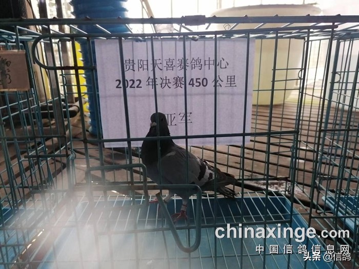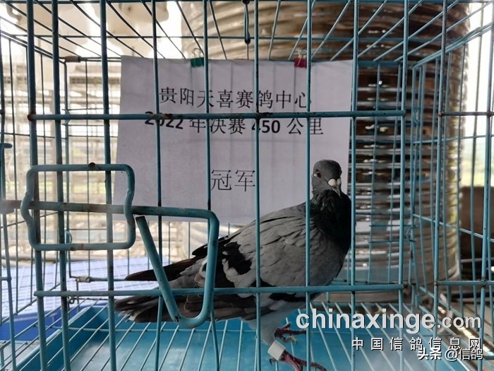 贵阳天喜赛鸽中心2022年第三关450公里决赛,上笼赛鸽3210羽,在广西南宁市龙门水都风景区开笼放飞,当天仅归巢41羽,归巢率不足一成。贵州清镇鸽友雷竣博的一羽灰白条赛鸽,在如此条件下艰难归巢,飞出1002米/分的分速,获得了决赛冠军,这也是唯一一个分速超过一千的赛鸽。“铁鹰飞翔兄弟鸽舍”的一羽3011赛鸽,分速892米/分,获得了本次比赛亚军。