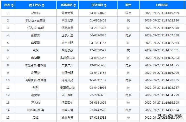 贵州红枫小棚第三关450公里决赛同步进行,共计5021羽赛鸽选手从广西南宁开笼出发,经过艰难飞行,当天仅归来35羽赛鸽,广东澄海参赛鸽友林韩麾下赛鸽率先报到,拿下决赛冠军桂冠,收获25万奖励。贵州贵阳鸽友谭震喜获第二名,获得20万的奖金。