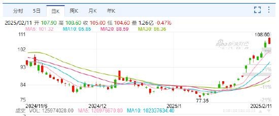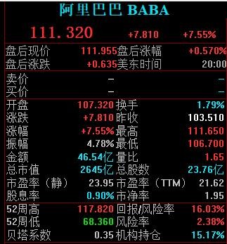 在聚焦AI+电商战略后,阿里业务逐步企稳,再加上Deepseek等AI带来的行业热潮,美股科技股出现分化,热门中概股集体上行,昨夜美股收盘时,阿里巴巴大涨7.55%,报111.32美元。