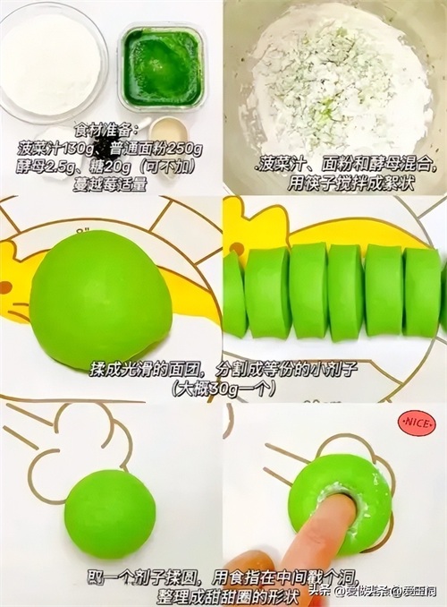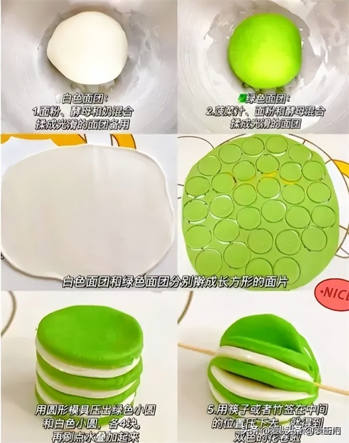 绿色面团和面配方:普通面粉150g,菠菜汁80g,酵母2g。