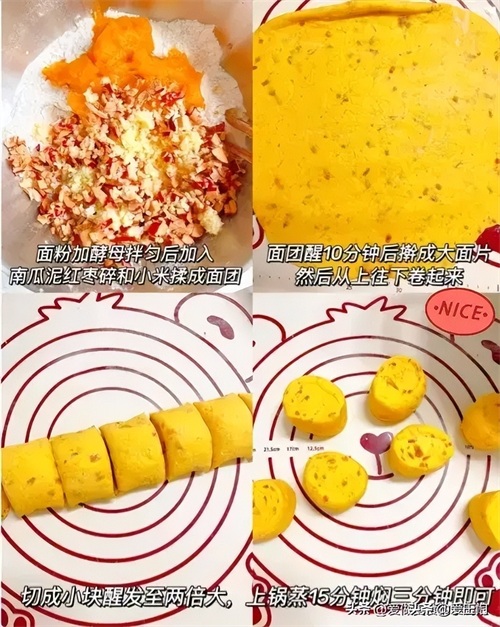 食材:面粉300g,南瓜泥180g,酵母3g,红枣40g,小米50g。