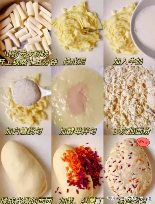 食材:山药、紫薯、红薯、牛奶、酵母。