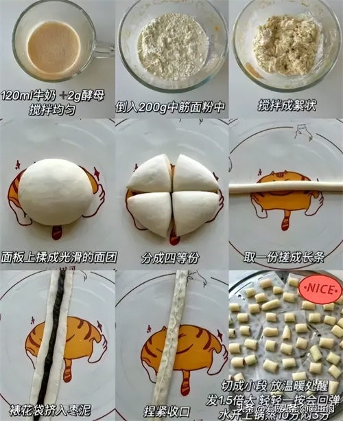 白色面团和面配方:普通面粉150g,牛奶78g,酵母2g。
