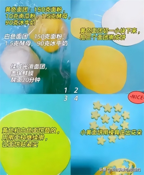 黄色面团:面粉150g,10g南瓜粉(也可用南瓜泥),酵母1.5g,冰牛奶90g。