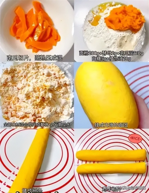 食材:面粉200g,南瓜泥110g,白糖5g,植物油10g。