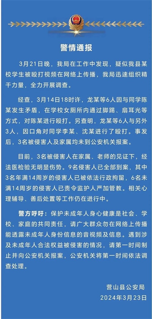 对于这一事件,当地警方迅速展开调查,教育和科技体育局也对此事进行了介入调查。根据警方通报,9名涉案人员已被全部抓获,其中3名年满14周岁的侵害人被依法行政拘留,6名未满14周岁的侵害人则责令监护人严加管教。
