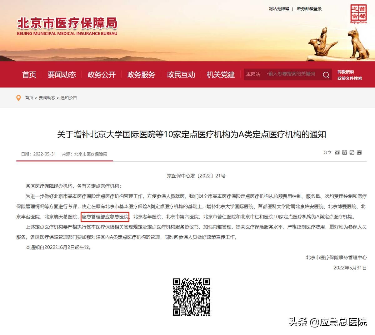 2022年5月31日,北京市医疗保险事务管理中心下发通知,批准应急总医院为A类定点医疗机构。
