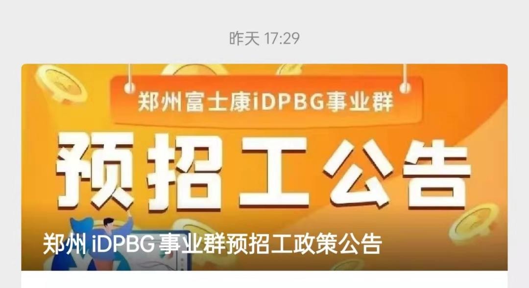 11月12日,郑州富士康iDPBG事业群发布预招工公告称,因公司业务需要,现计划启动预招工。招工措施新增稳岗津贴,11月13日至19日报到的员工,在职满30天额外享有3000元稳岗津贴。