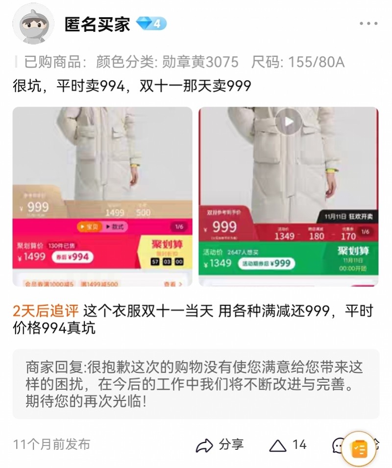 11月12日,南都记者查询发现,该款羽绒服在淘宝波司登官方旗舰店早已上线销售,其商品评价栏中,早在一年前的11月就有买家差评,称“这个衣服双十一当天用各种满减还999,平时价格994,真坑。”