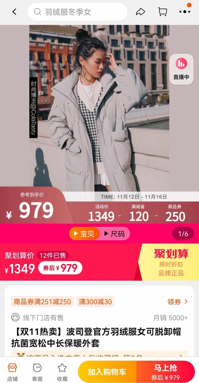 波司登官方旗舰店客服向南都记者确认上述羽绒服与引起风波的款号为B00145252F的羽绒服为同款。该款羽绒服目前仍在售,标价为1349元,券后价979元。至11月12日12时,商品页面显示月销5000+,并标注“聚划算限时折扣”,已售12件。南都记者询问目前价格是否“双11”活动价,波司登客服回复称“现在优惠都是以实时页面为主的”。