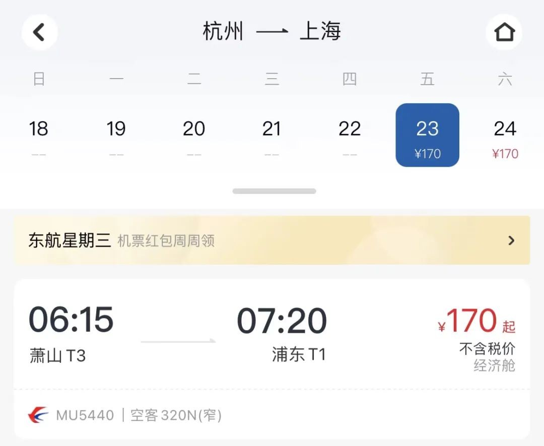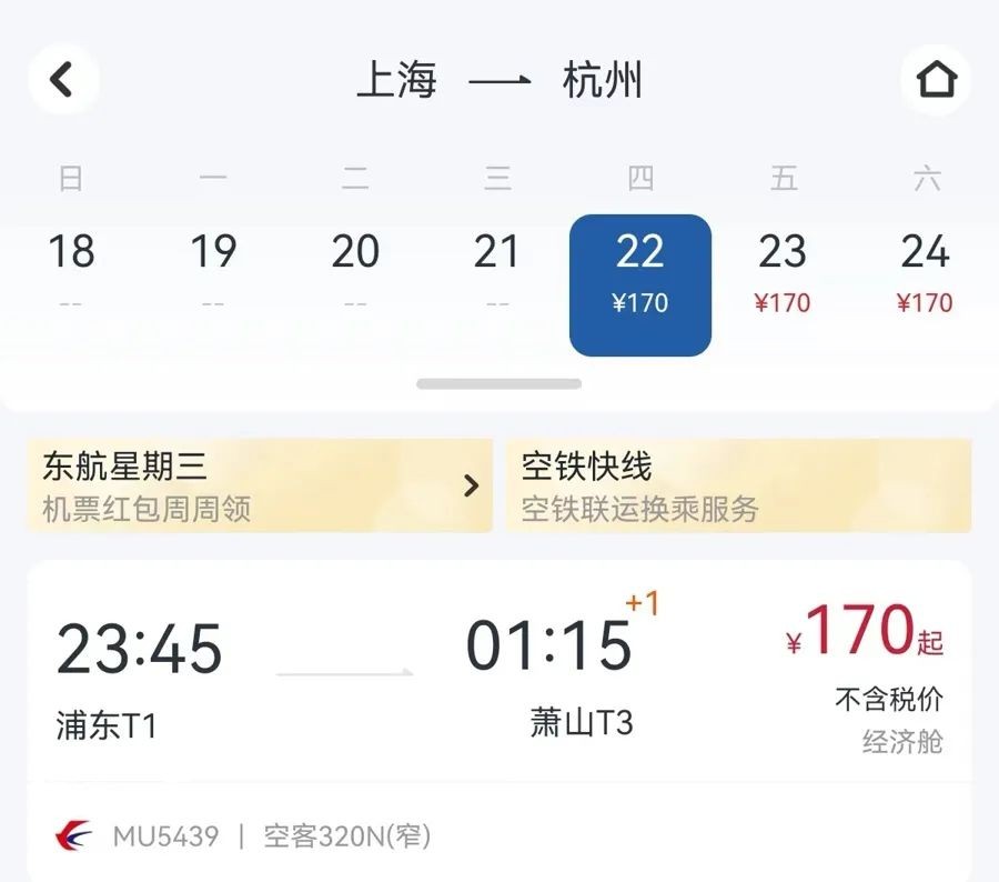 从2月22日起,每天都有一趟从上海到杭州的航班,由东航执飞,该航班计划晚上23时45分从上海浦东机场起飞,全程176公里,飞行时长约1小时30分钟,将于次日凌晨1时15分到达杭州萧山机场。目前经济舱票价1.7折单程170元起(不含机建燃油费)。