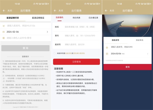 在“航空”服务页中,支持在线申请开具“延误证明”、办理“选座值机”、按航班号或按起降地,查询东上航承运的“航班动态”等。