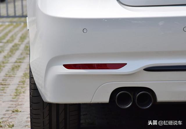 车尾部分,两边是简约工整的LED尾灯组,中间微微翘起的小鸭尾造型。尾灯组晶莹剔透,车尾上集成了刹车灯带,点亮后具有一定的辨识度。下面采用单边双管出气的排气管,虽然运动感不是那么的强烈,但是整个车尾看起来非常的年轻有个性。