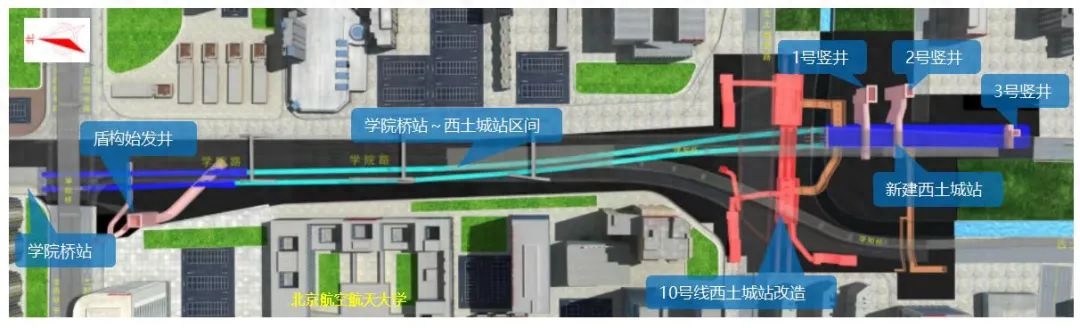 包含(1站1区间1改造)西土城站、学院桥站~西土城站区间、10号线西土城站改造,该项目南至西土城路北,北至学院桥,全长1522m。