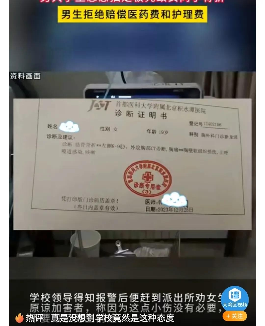 女生表示,至今都未得到男生的一句道歉,学校方面还反复打电话告诉女生此事无法立案也无法构成故意伤害,并称伤情也无法鉴定为轻伤。这种言论让人震惊和愤慨,不仅对受害者不负责任,更是对法律和正义的漠视。