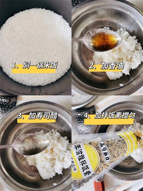 1.蒸米饭,趁热加入寿司醋(米饭:醋 按5:1) 搅拌均匀,凉凉待用。想要米饭粘一点的话就适当加点糯米。再放一些拌饭素。这样口味可以多种多样还省去了调味的麻烦。