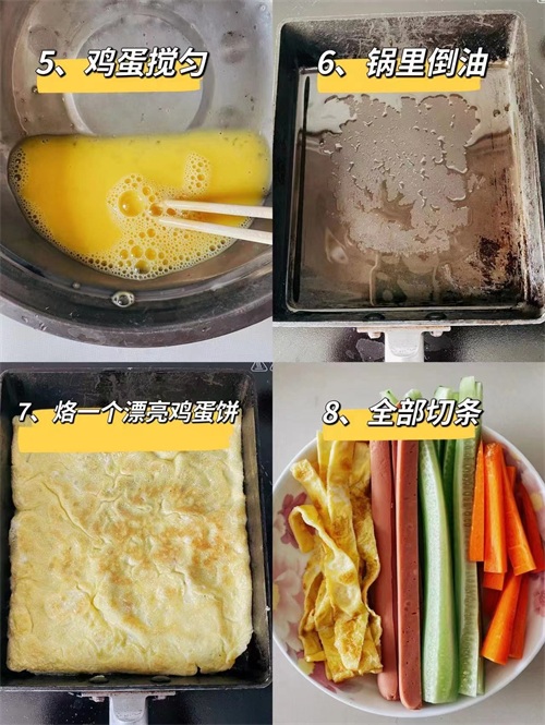 2.煎鸡蛋饼切丝,自己喜欢的黄瓜,胡萝卜,火腿等切丝待用(喜欢肉松,辣椒酱,沙拉酱之类的同学,也请准备好这些食材待用)