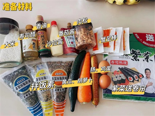 准备材料:大米,寿司醋,香油,沙拉酱,番茄酱,肉松,蟹足棒,寿司海苔,拌饭素,黄瓜,胡萝卜,肠,鸡蛋。